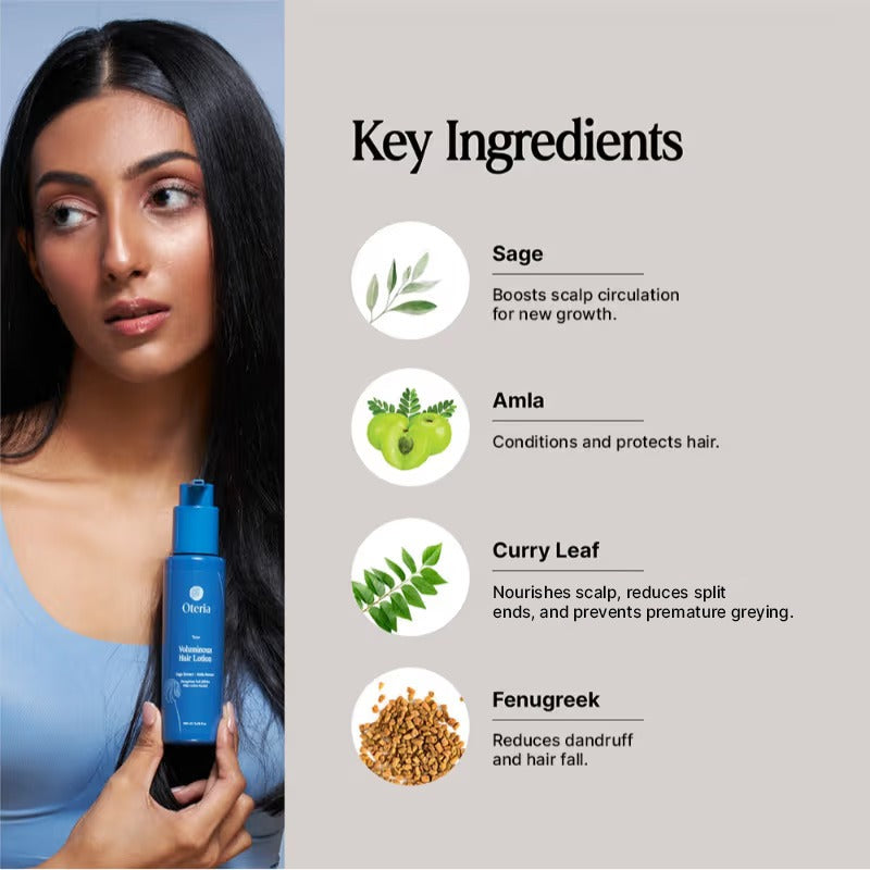 • ओटेरिया भोल्युमिनस हेयर लोशनले कपाल र टाउको दुवैलाई गहिरो रूपमा हाइड्रेट र पोषण दिन्छ। यसले कपालको फोलिकल्सलाई बलियो बनाउँछ, कपाल झर्न कम गर्न मद्दत गर्छ र समयपूर्व सेतो हुनबाट रोक्छ।